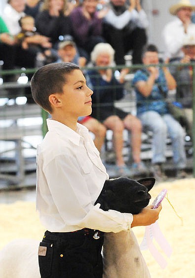 Ethan Bay of the Montford Egan Eagles 4-H Club holds his sheep Zues and his ribbon for winning the reserve championship in the junior novice showmanship at the Flathead County Fairgrounds on Tuesday. (Aaric Bryan/Daily Inter Lake)