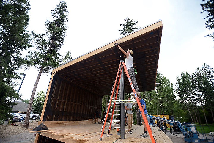 Joel Effland of the University of Texas Austin, atop ladder, works on the stage that the 100 Fold Summer Studio students are building in Lakeside on Monday, August 10. (Brenda Ahearn/Daily Inter Lake)