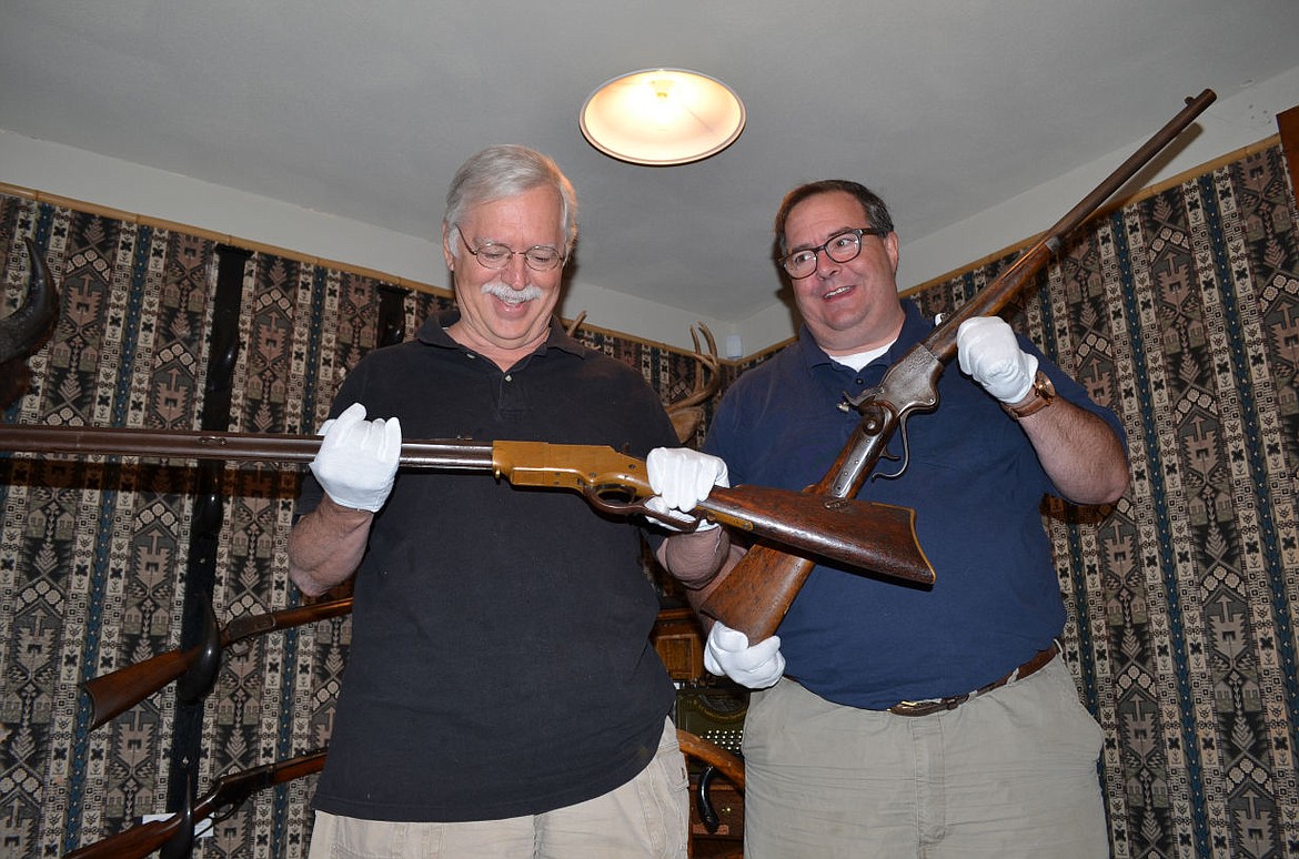 Garry James, senior editor of Guns & Ammo Magazine,(left) and Philip Schreier, senior curator for the NRA, inspect two of the firearms from Charles E. Conrad's original collection. James holds the Henry repeating rifle, a .44 caliber rifle only manufactured between 1860-1866. Schreier holds a Sporterized Spencer Repeating Carbine; the last one manufactured in 1865. (Seaborn Larson/Daily Inter Lake)