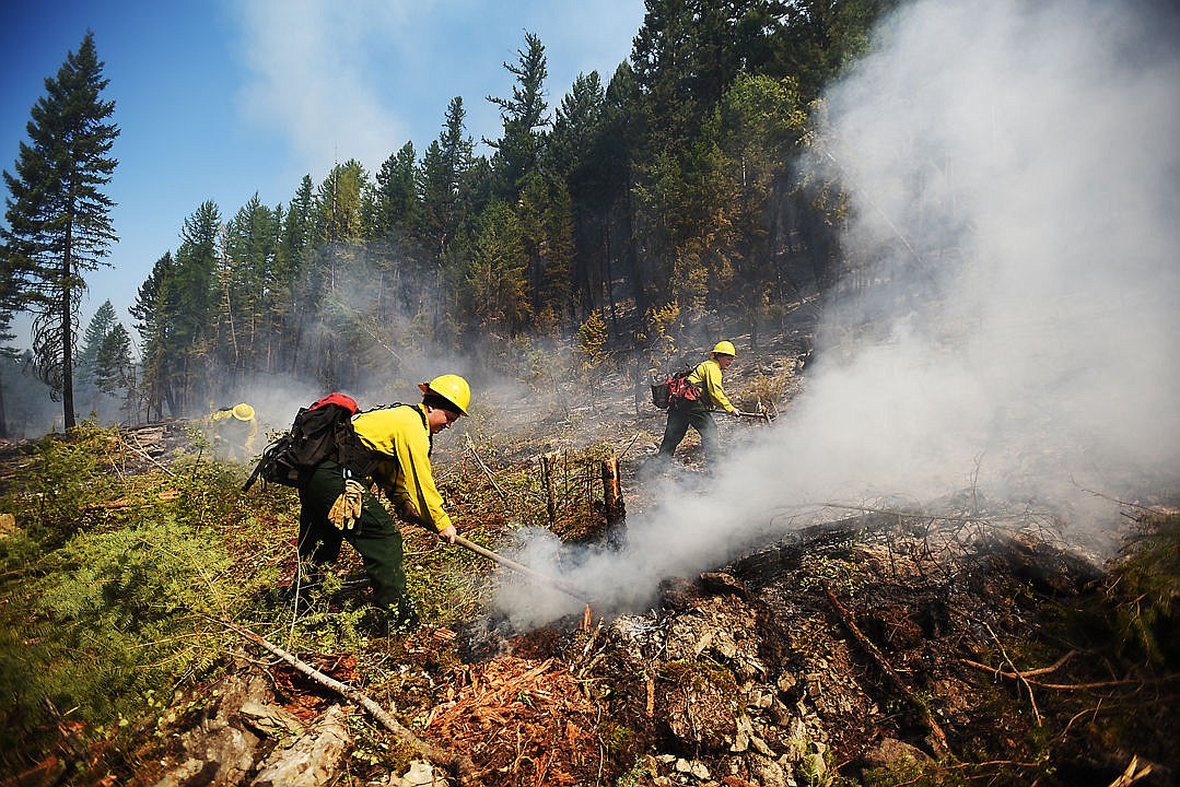 Abbey Buck, center, her sister Breanna Buck, right, and Darci Hooper, background, from a fire crew out of Geraldine work through the hotspots on the Marston fire on Wednesday, August 19, south of Eureka. (Brenda Ahearn/Daily Inter Lake)