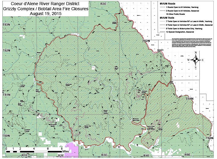 For a detailed look at the closure area please see the attached map, or visit the Idaho Panhandle National Forest's Wildfire Emergency Closure webpage. Additionally, a fire information call center has been established at (208) 765-7383 and can provide information related to area wildfires and closures