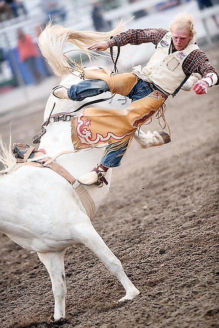Tyler Nelson of Victor, Idaho dismounts Blue Wings after a successful ride on Thursday, August 20, at the Northwest Montana Fair Rodeo. Nelson scored 77 on his ride. (Brenda Ahearn/Daily Inter Lake)