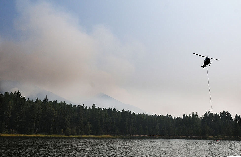 A helicopter fills a bucket full of water from the private Lake Olga while fighting the Marston Fire on Wednesday. (Aaric Bryan/Daily Inter Lake)