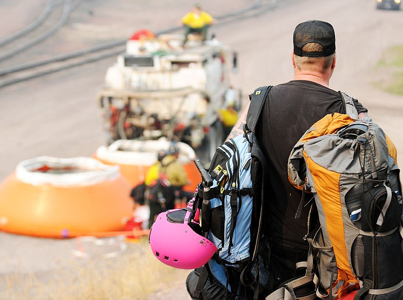 Jared Warden brings a load of gear to a car as he prepares to leave Essex on Thursday. (Aaric Bryan/Daily Inter Lake)