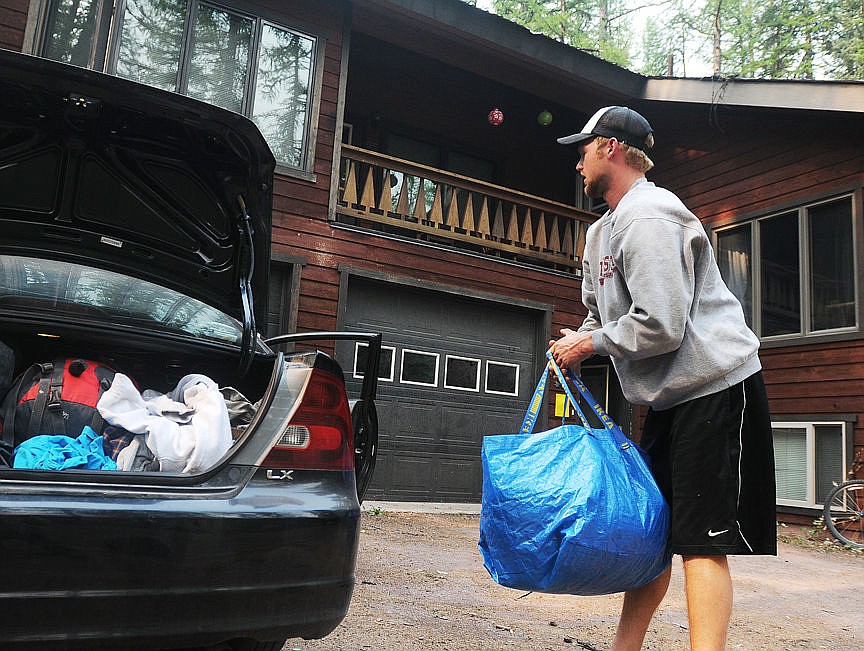 Paul Harrold of Essex puts his last bag in his car as he evacuates on Thursday. (Aaric Bryan/Daily Inter Lake)