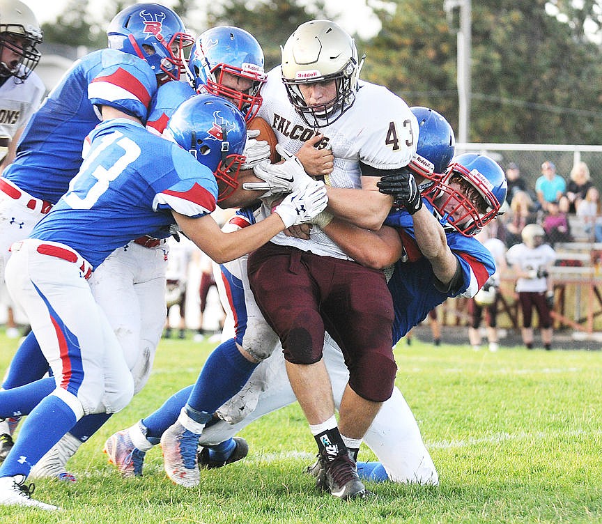 Bigfork Viking defenders gang tackle Florence's Bridger Dragoo during the third quarter of the Vikings' 18-13 loss to the Falcons in Bigfork on Monday. (Aaric Bryan/Daily Inter Lake)