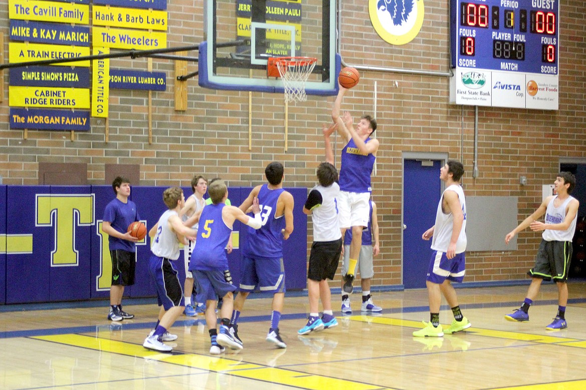 Trais Hoisington leaps to make a basket during a practice session of the Thompson Falls boys basketball team.