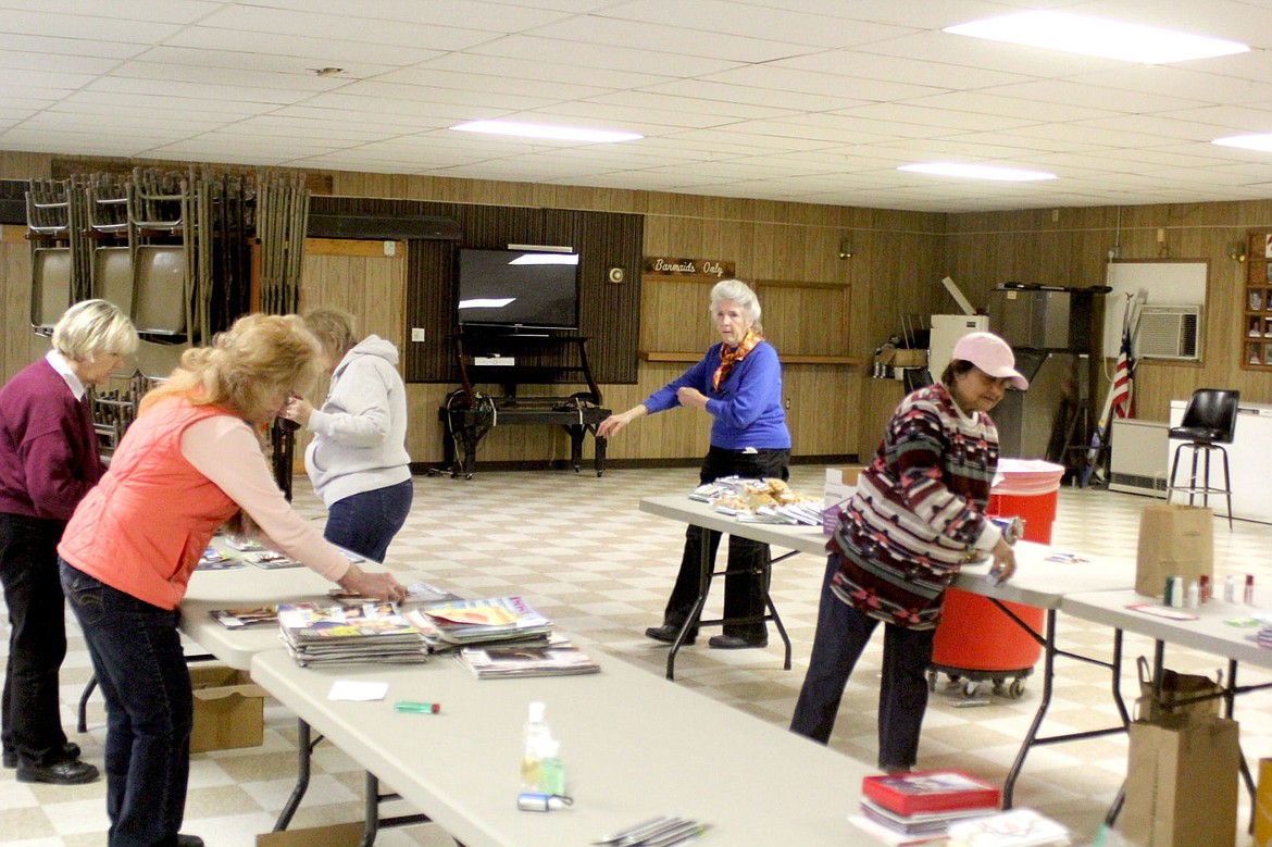 Members of the Veterans of Foreign Wars Women’s Auxiliary for Post 3596 sort items to be sent to active duty troops.