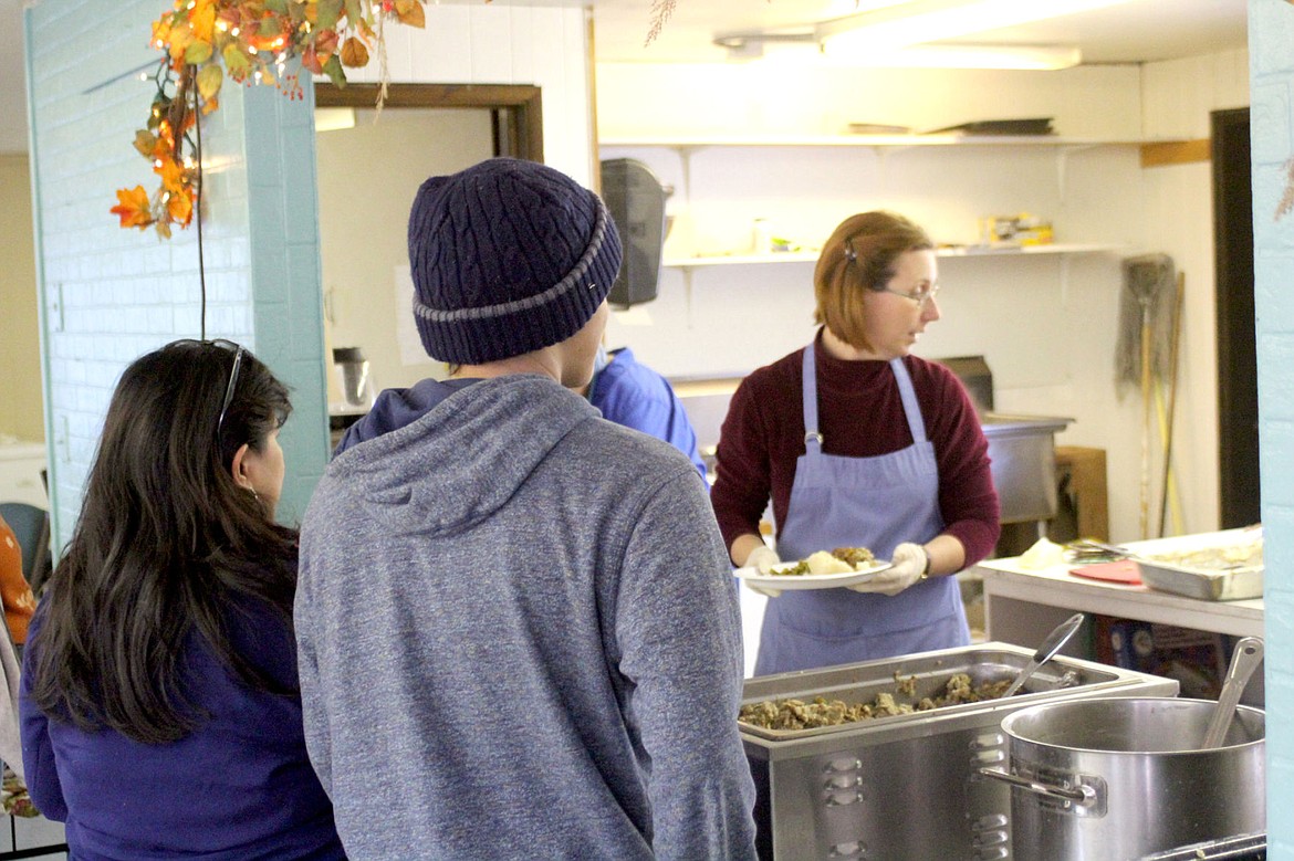 Mary Ellen Crabtree prepares a plate of Thanksgiving staples during the community Thanksgiving meal at the Plains soup kitchen.