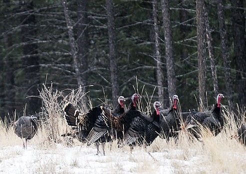 A group of tom turkeys lead the hens away near Whitefish Mountain Resort on Thursday. (Aaric Bryan/Daily Inter Lake)