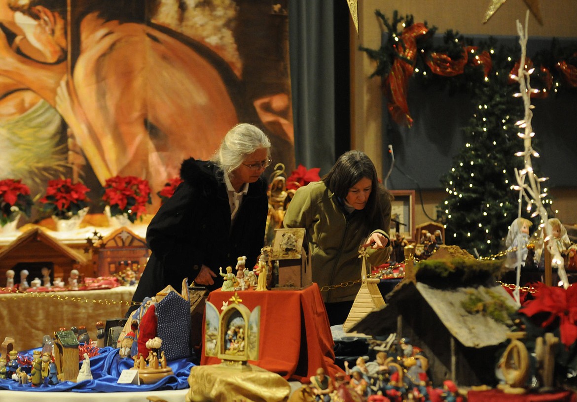 Joan Libsack-Maynard, left, and Sharton Tuttle look over the nativities during the Community Christmas Celebration at the Mormon Church in Kalispell on Thursday. More than 350 nativities are on display at the celebration from 11 a.m. to 5 p.m. Saturday. (Aaric Bryan/Daily Inter Lake)