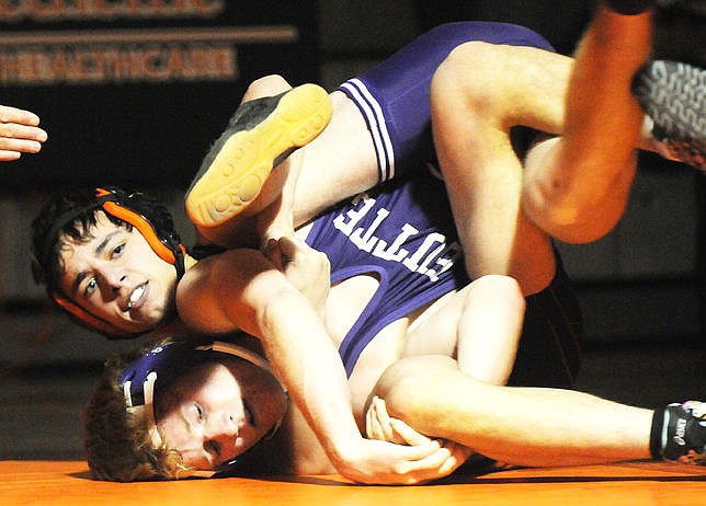 Flathead's Payton Hume puts Butte's Kaleb Ferriter in a cradle during a 15-4 major decision in the 145-pound match at Flathead on Friday. The Braves won the dual 35-31. (Aaric Bryan/Daily Inter Lake)