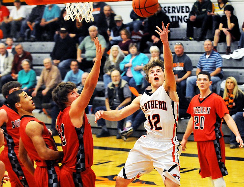 Flathead's Kye AuClaire drives past a group of Bozeman defenders for a basket during the first quarter at Flathead on Saturday. (Aaric Bryan/Daily Inter Lake)