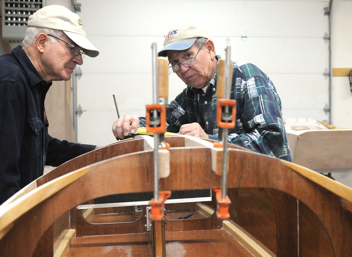 Tom Schock takes a measurement for a mast partner on his 6-foot ice boat as Mel Voos checks his work at the Montana Wooden Boat Foundation's workshop in Lakeside on Thursday. (Aaric Bryan/Daily Inter Lake)