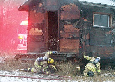 Brady Fiscus, left, holds the fire hose as Adam Orr douses a smoldering fire underneath an outbuilding behind the Mental Health Center Monday evening. With Ryan Andreessen looking on.