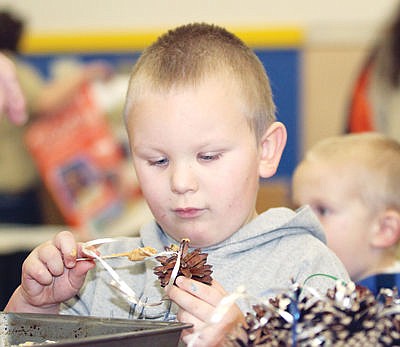 Brady Laffoon, 4, tries his hand at making a pine cone bird feeder Saturday at Asa Wood.