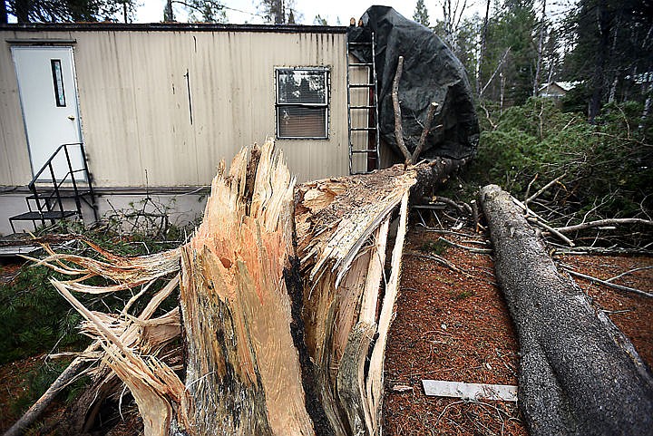 A split tree with a double trunk came down in high winds at the Middle Fork Motel property in Hungry Horse on Wednesday, December 9. According to resident Don Cruzan the high winds have been coming in waves. "We'll get winds at 50 to 60 miles, then they'll slow down and go quiet for a bit before another blast hits," said Cruzan. (Brenda Ahearn/Daily Inter Lake)