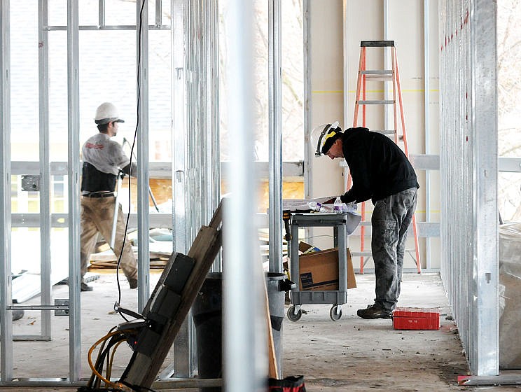 Kent Rosenlund looks over the plans while doing electrical work on the second floor of the South Campus Building. (Aaric Bryan/Daily Inter Lake)
