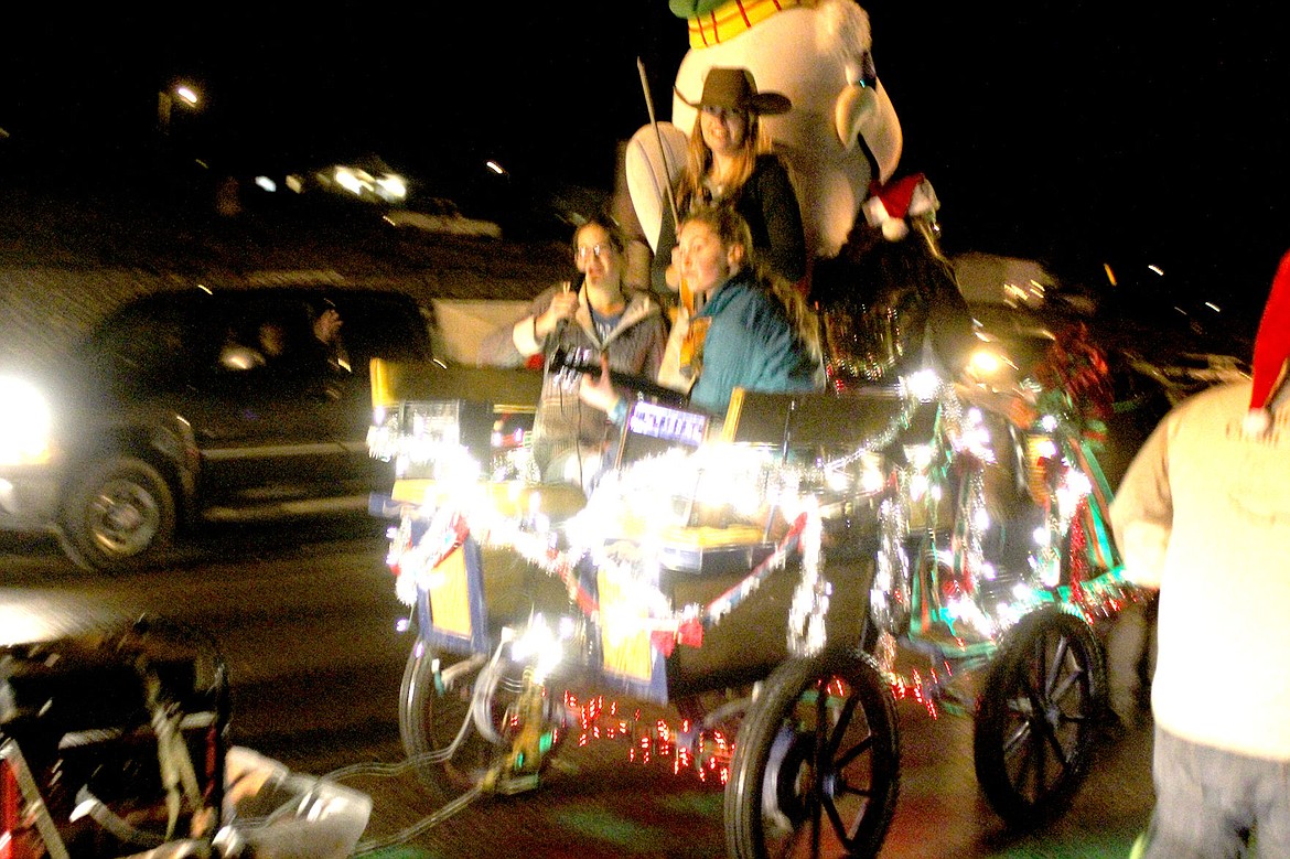 Teens play the guitar and violin as they sing Christmas carols during their float ride through Thompson Falls.