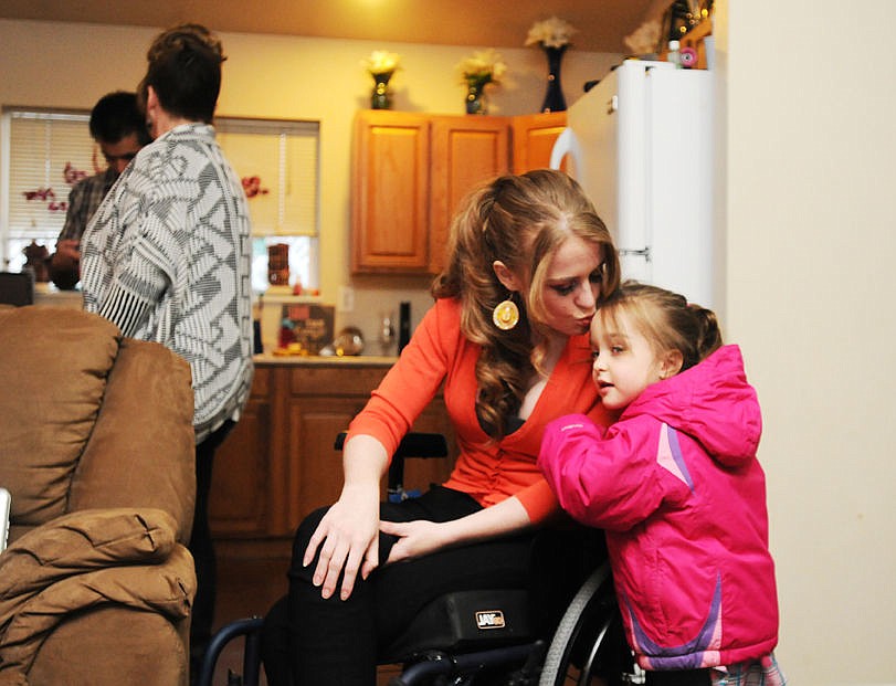 Starla Hilliard-Barnes kisses her daughter Elissiah goodbye before the 3-year-old leaves with her grandma Wendy Hilliard. (Aaric Bryan/Daily Inter Lake)