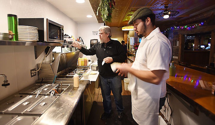 Dave Sheeran and Giovanni Lopez add the final touches to dishes before they are served up at Mama Blanca's on Thursday, December 10. (Brenda Ahearn/Daily Inter Lake)