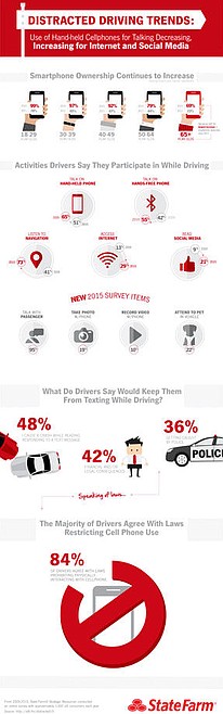 (NewsUSA) - NewsusaInfographic - A huge majority of drivers may agree with laws restricting cell phone use while behind the wheel -- 88 percent, to be precise -- but that doesn't mean they're practicing what they preach. Yes, talking on handheld phones is down 14 percent from 2009, according to a new survey by State Farm. But both accessing the Internet and reading social media while driving have more than doubled.
