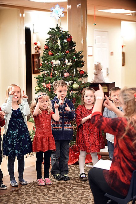 Trinity Lutheran Kindergarten teacher Susan Junk leads students Audrey Rasmussen, left to right, Ada Thiel, Gavin Knapp, Katrina Bochman, and Landon DePaulin Christmas carols at Prestige Assisted Living in Kalispell on Monday morning, December 14. (Brenda Ahearn/Daily Inter Lake)