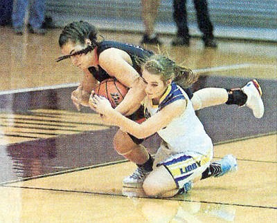 Libby's Ashley Walker looks to pass while being defended by Polson's Brenna Clarke Saturday night in Polson.