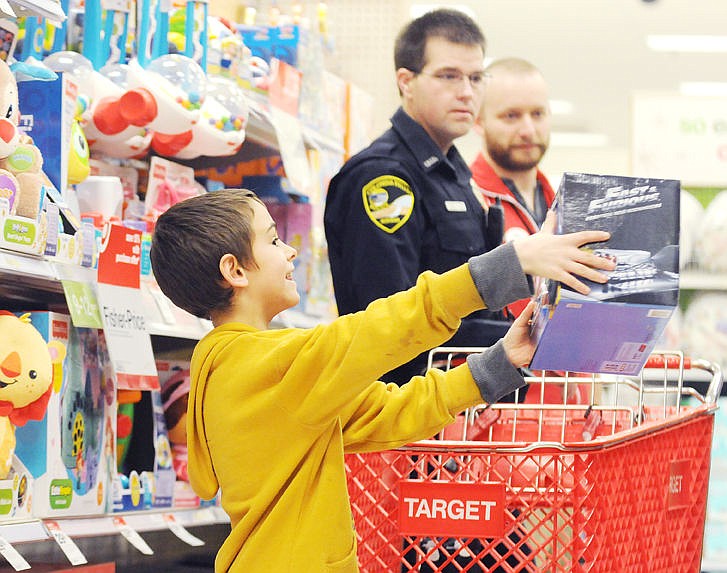 Tristan Nichoson, 9, shows Columbia Falls Police officer Jared Haddenham a remote car he wants for Christmas during the annual Shop with a Cop session at the Target store in Kalispell on Wednesday. Five children were paired with Columbia Falls Police Department members to pick out gifts for Christmas. (Aaric Bryan photos/Daily Inter Lake)