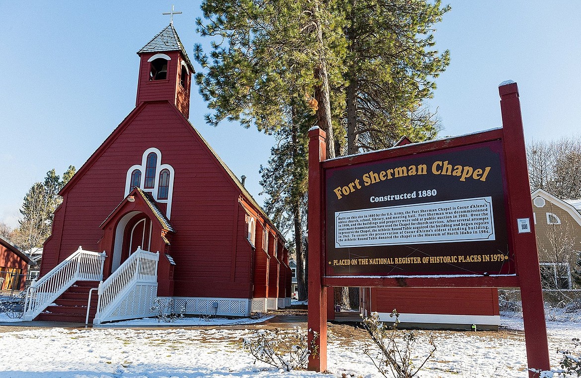 The Fort Sherman Chapel continues to be a historic landmark in North idaho. Built in 1880 by the U.S. Army, the chapel is Coeur d’Alene’s oldest church, school, library and meeting hall. It was included in The National Register of Historic Places in 1979, and was donated by the Athletic Round Table to the Museum of North Idaho in 1984.