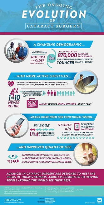 (NewsUSA) - NewsusaInfographic - Despite all the talk about millennials, baby boomers still comprise almost a third of the U.S. workforce, spend about $157 billion annually on travel, and show little evidence of slowing down. In fact, their need for "functional vision" to accommodate their active lifestyles is a key reason why cataract surgery is increasingly becoming a viable option for patients who don't exactly fit the stereotypical profile. According to a recent report cited by a href="http://www.abbott.com">Abbott, an estimated 870,000 such procedures are projected to be performed in 2015 on those younger than age 65.