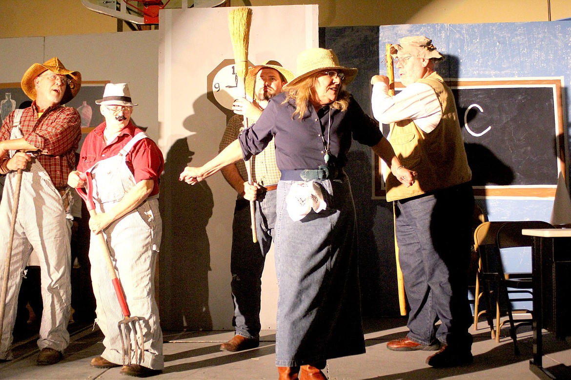 One of the Lady Libbies protests the lack of women in the cast during the production of The Tragedy of Ragweed Cowboy Joe at the Paradise School.