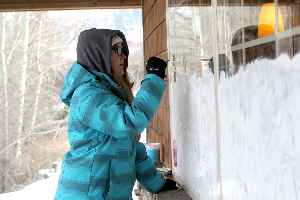 Makenna Smith paints in the small details of the North Pole scene she and her partner, Jeffrey Marshall, put on the window of the Plains Subway.