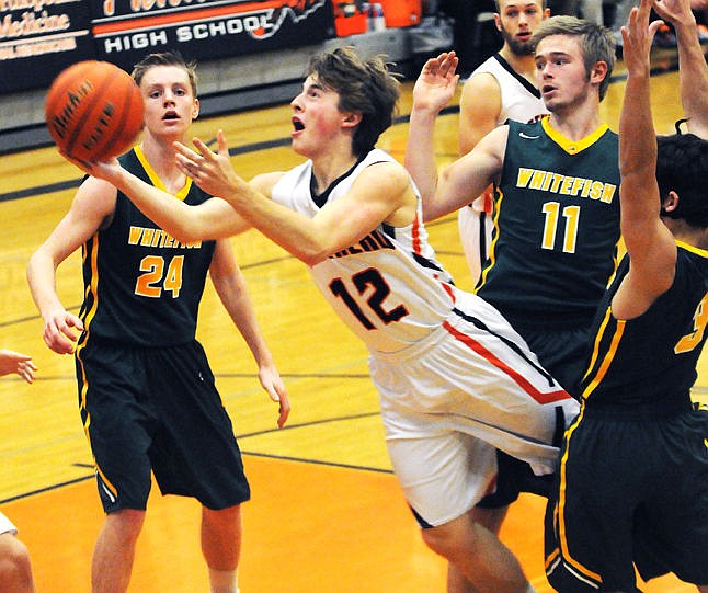 Kye AuClaire splits Whitefish defenders Zander Wold (11) and James Sampson (3) as he puts up a shot during the first quarter at Flathead on Friday. (Aaric Bryan/Daily Inter Lake)