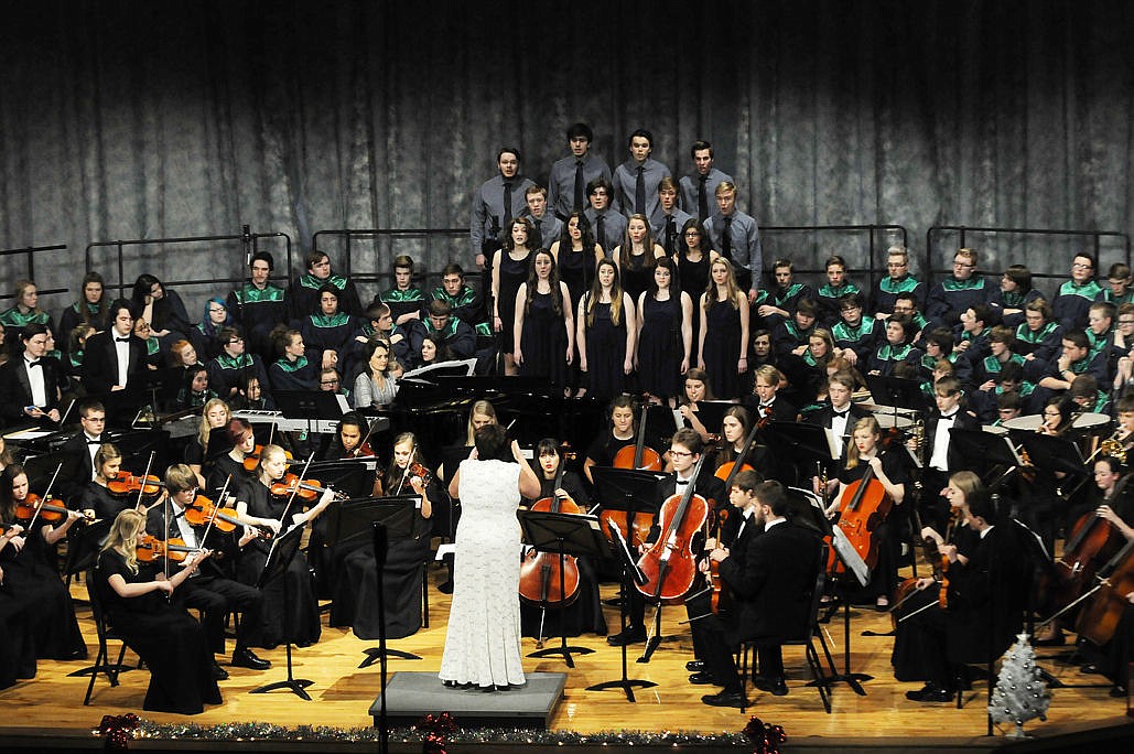 Sherry Simmons leads the Echoes and Orchestra iln The Christmas Song (Chestnuts Roasting on an Open Fire) during the first performance of the Glacier High Music Department's "And the Stars Sang," at the school on Thursday. (Aaric Bryan/Daily Inter Lake)