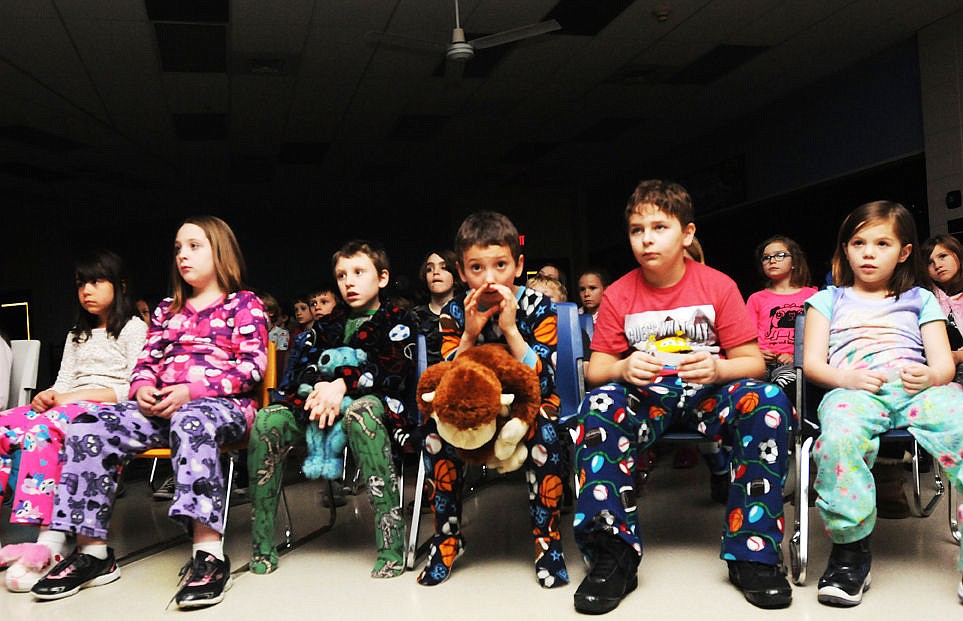 Muldown third-graders watch The Polar Express during a pajama party at the school on Friday. (Aaric Bryan/Daily Inter Lake)
