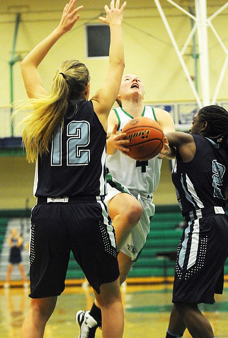 Hailee Bennett is fouled by Great Falls Hannah Collins as she drives to the hoop. (Aaric Bryan/Daily Inter Lake)