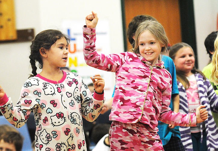 East Evergreen third-graders Memphis Vulles, left, and Brandi Coats dance while singing "Santa Claus is Coming to Town," during the school's sing-along on Tuesday. (Aaric Bryan/Daily Inter Lake)