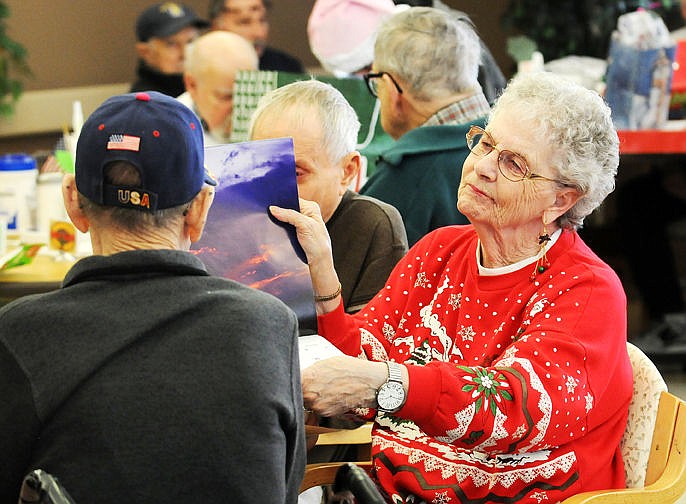Arlene Soderstrom shows her husband Bob Soderstrom a picture from the cowboy calendar he received as a Christmas gift at the Montana Veteran's Home. (Aaric Bryan/Daily Inter Lake)