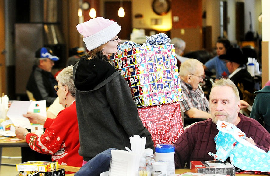 Jessica Groff of the Montana Veteran's Home carries gifts to the residents. (Aaric Bryan/Daily Inter Lake)