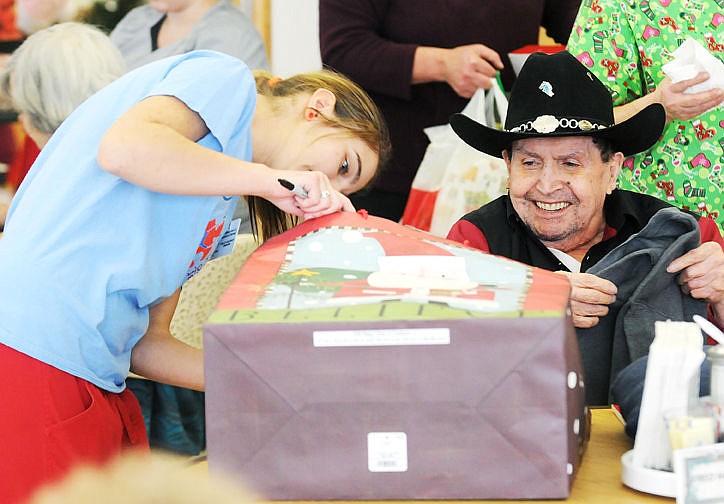 Shelby McGrady, a certified nurse assistant, helps Monroe Davis open his Christmas presents at the Montana Veteran's home in Columbia Falls on Wednesday. Hundreds a gifts were donated for the residents of Montana Veterans Home. (Aaric Bryan/Daily Inter Lake)