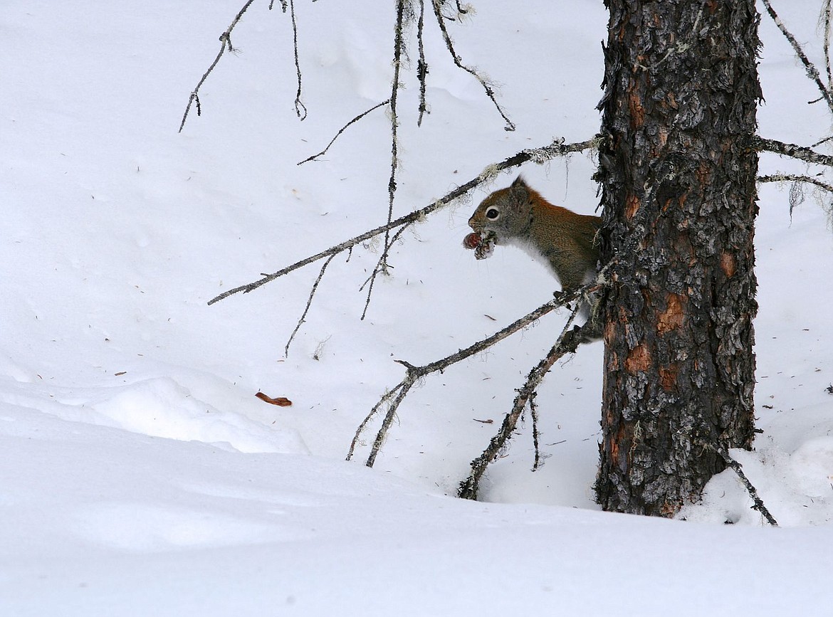 Heavy snow on tree branches restricts the arboreal movement of pine martens and squirrels.