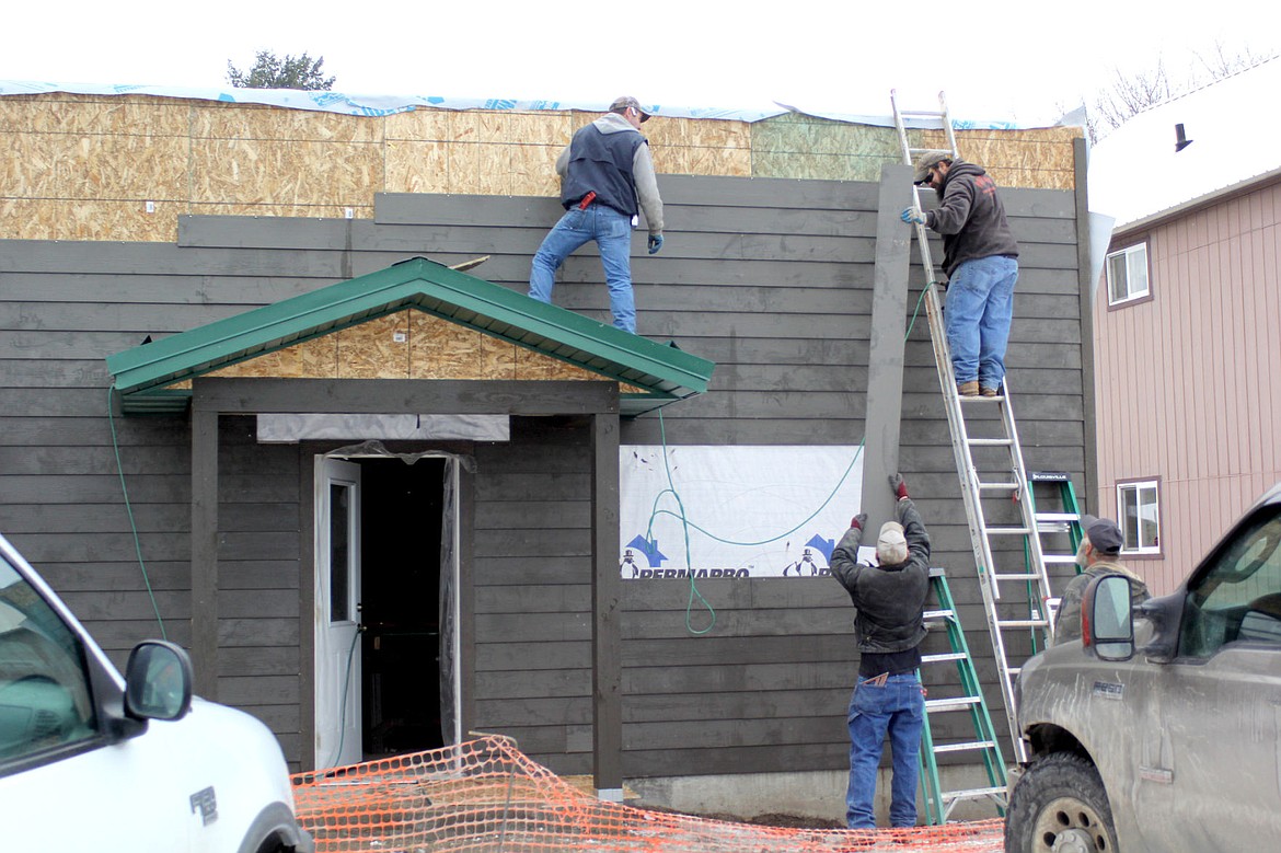 Workers put up the siding on the new office for the Clark Fork Valley Press.