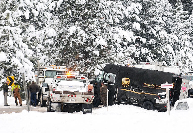 A UPS delivery truck slid off the road after a collision with a semi-trailer Thursday morning on Farm-to-Market Road. The accident caused a fuel spill and a section of road was closed to traffic for two hours as crews worked to clean it up. There were no injuries. UPS said deliveries from the truck will be late, but they will make it. No packages were damaged in the crash. (Aaric Bryan/Daily Inter Lake)