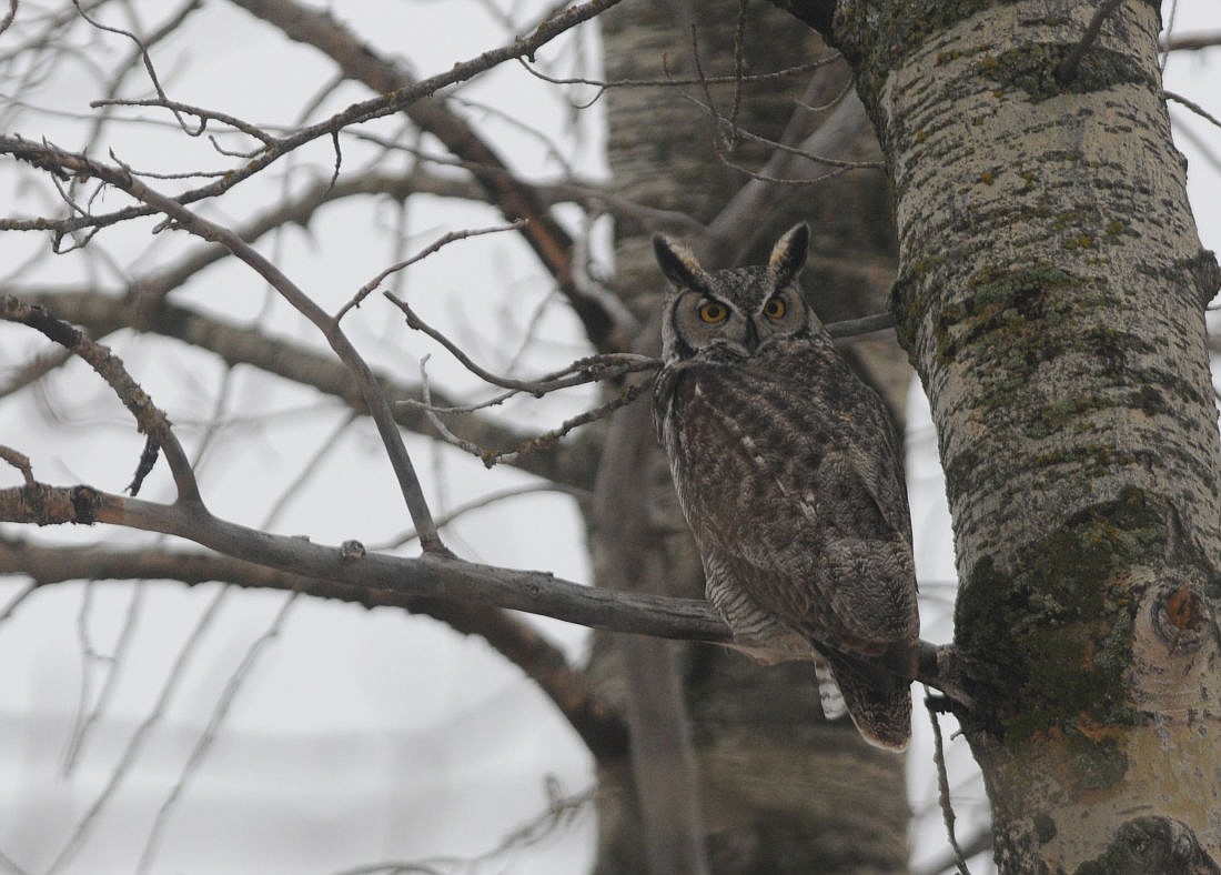 “The short-eared owls like to get into the brush there, where the great horned owls can’t get them,” he explained. Along a low ridge, one of the aforementioned predators kept watch from its high perch in a birch tree.