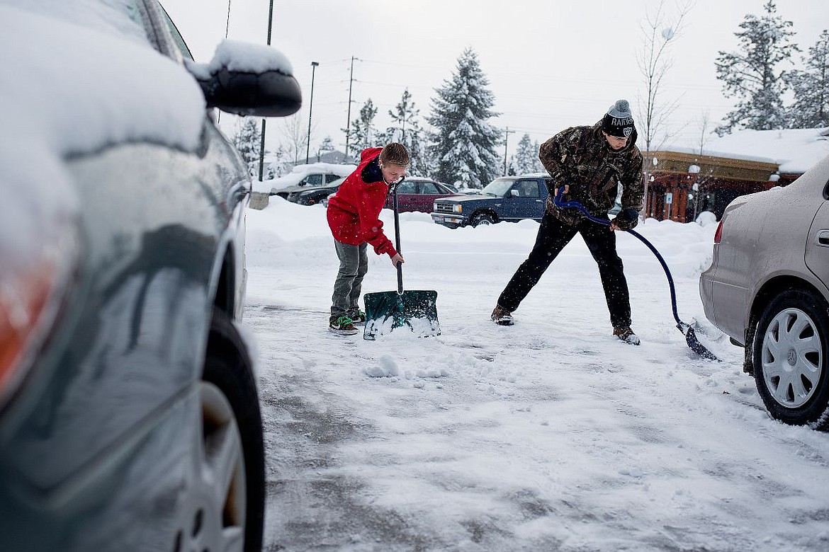 Jordan Cruz, 19; John Carston, 14; and David Carston, 13, were out with their shovels to help clear the parking lot of the snow and ice so the older residents would have easier access to their vehicles.