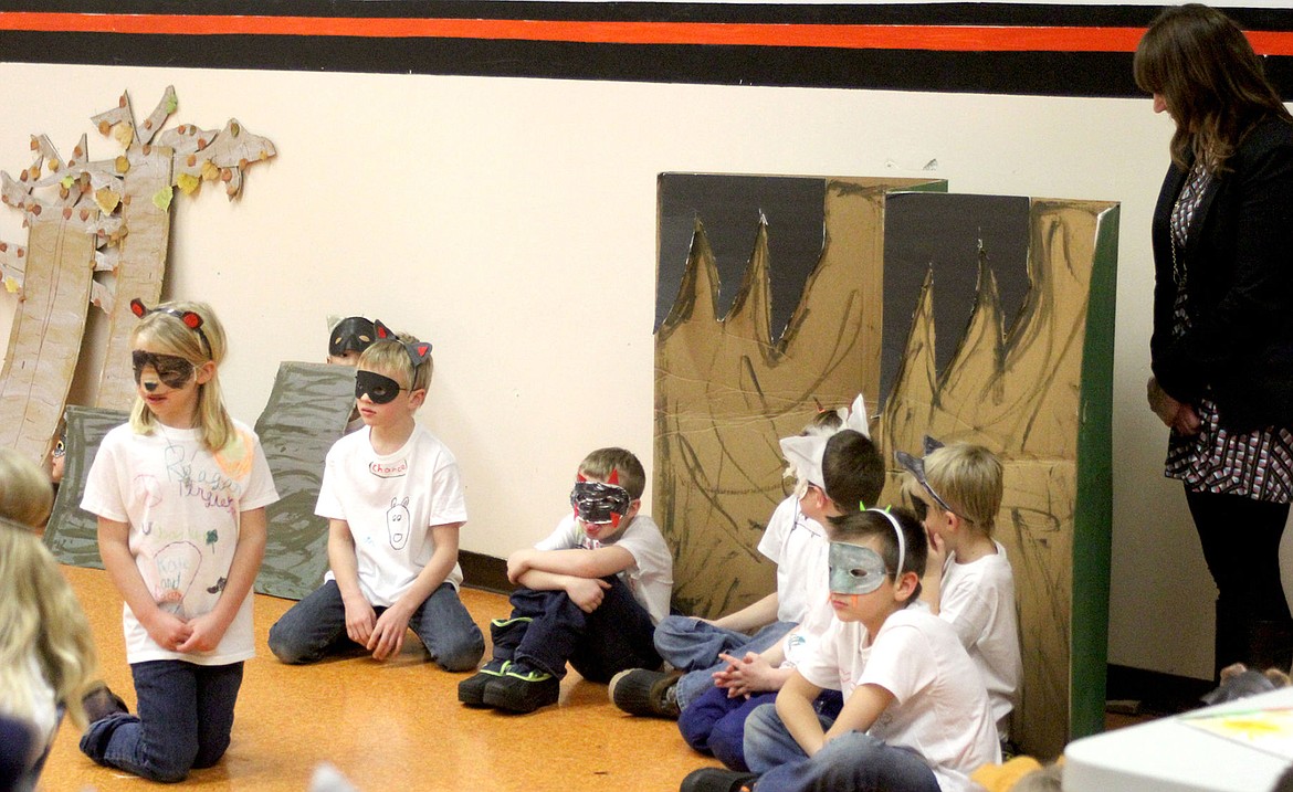 Two young bears talk with a group of bats as they look for their home during a play by Plains second graders as part of their arts integrated science curriculum.