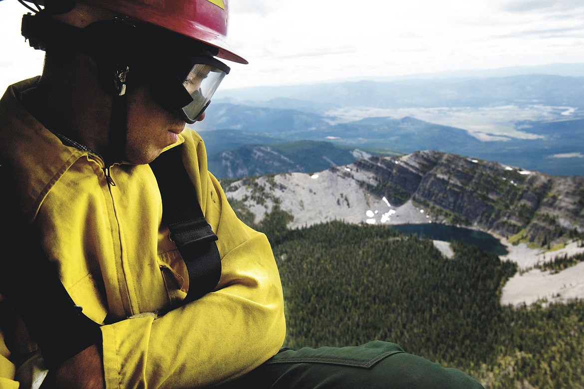 A Department of Natural Resources and Conservation firefighter stares out of a helicopter during a helicopter training class.