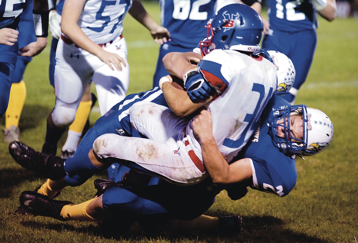 Jase Sorenson tackles a Bigfork Viking during the Thompson Falls homecoming game. The Bluehawks finished the game 21-14.