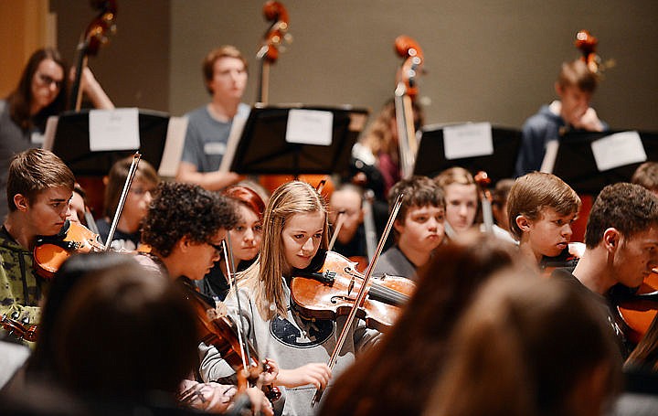 Glacier sophomore Anna Cecil, center, and students from Flathead, Helena Capital, Helena High and Big Sky rehearse together for the 52nd AA Orchestra Festival on Monday, February 2, at Glacier High. There is a free concert tonight featuring the combined Festival Orchestra under the direction of Dr. Julian Gomez-Giraldo at 7 p.m. at the Glacier High School Performance Hall. (Brenda Ahearn/Daily Inter Lake)